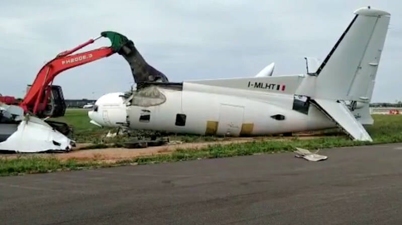 In January 2015, the Italian CAA ordered Miniliner to end operations due to financial difficulties and the Fokker cargo fleet was then stored at Bergamo. After more than 5 years, the fuselage of their Friendship I-MLHT (10382) was torn to pieces by South East Aviation Services and sold for metal recycling. So, this F27 was not exported, as we already supposed in Fokkernews #24. Not the best picture, but the intention is obvious (still extracted from an anonymous Youtube video; Bergamo, April 16, 2020)