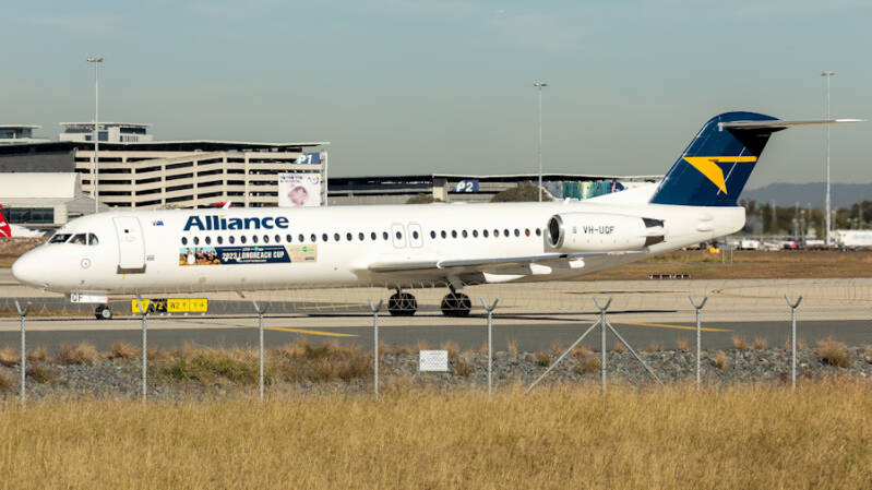 During a short period Alliance Airlines had a sticker applied on F100 VH-UQF (11456), promoting the 2023 Longreach Cup (horse racing) in September 2023. (Jonesy’s Photography on Flickr; Brisbane, 1 June 2023)