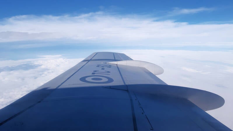 We taxied out again towards runway 13 and with no time wasted the grey Fellowship was back in the grey skies. This time, I (Lars) noticed that there was some ice accumulation on the engine inlet cowling and the engine cone. I had never seen this before, so I decided to film it. Exactly then, the deicing system started doing its job and in less than a second, all ice was dissolved. Very spectacular to see, you should definitely check the video. We were a couple of minutes into the flight and enjoying every second of it, when one of the cabin attendants invited us over to the flight deck for meeting the pilots. We walked along and behind the curtain the cockpit door was opened for us. We introduced ourselves and the crew was excited to have us in their office. The cockpit was old but simple. A thing that immediately stood out were the throttle levers, one pair for each pilot. The pilots were also happy with the cartoon so we took a photo of it in the flight deck mid-flight.